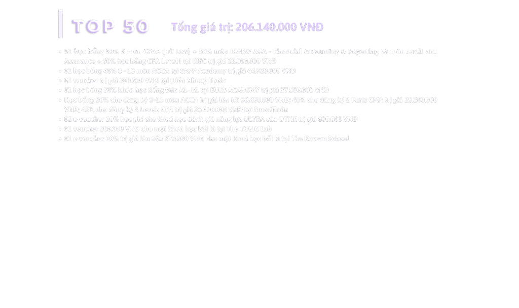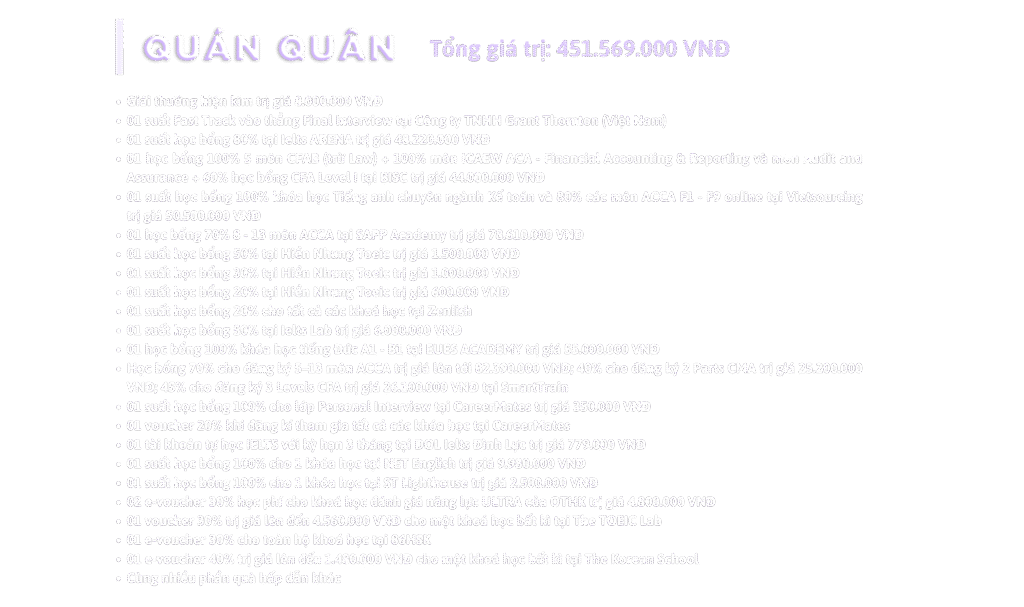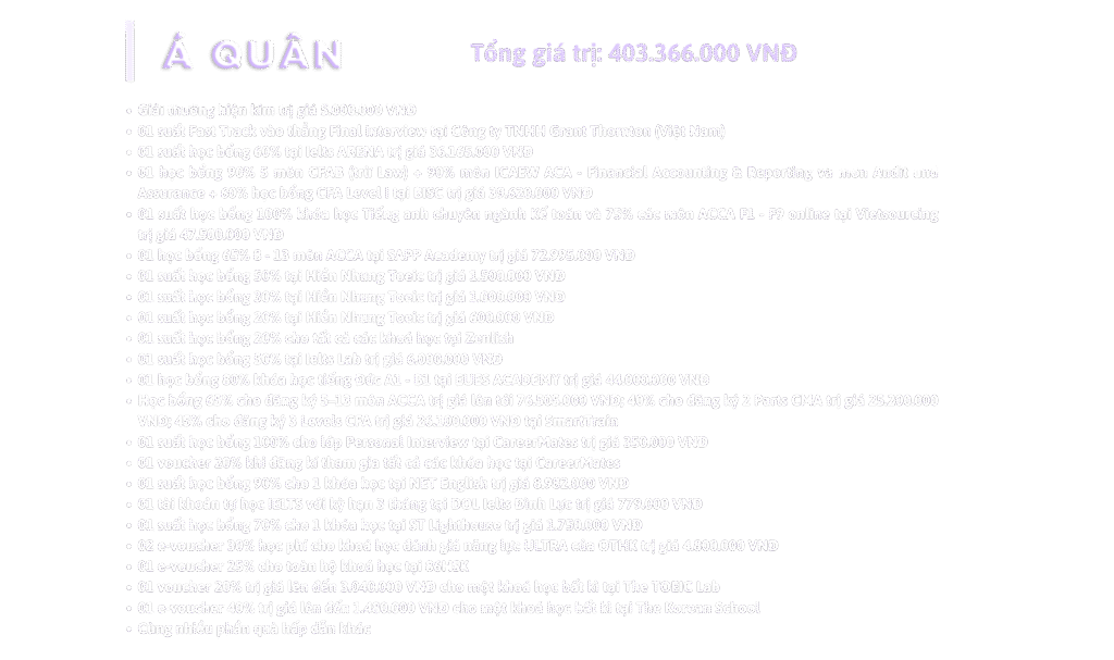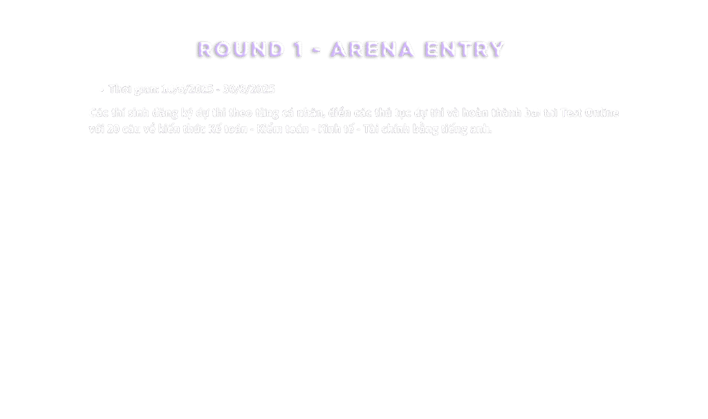 Trở lại với mùa thứ IX, Cuộc thi A&A ARENA: Đấu trường Kế Kiểm 2025 có một diện mạo hoàn toàn mới, mở ra cơ hội được cọ xát với các công ty Kiểm toán hàng đầu. Không chỉ là sân chơi học thuật, cuộc thi còn giúp sinh viên tiếp cận thực tiễn nghề nghiệp và rèn luyện tư duy phân tích phản biện. Những thử thách chuyên sâu giúp các thí sinh tích lũy kinh nghiệm và hoàn thiện kỹ năng cần thiết. Hàng loạt giải thưởng hấp dẫn đang chờ đón những thí sinh xuất sắc nhất.