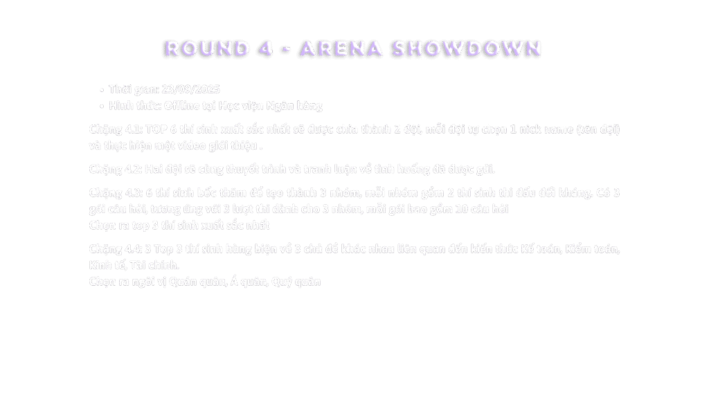 A&A ARENA là một cuộc thi học thuật về chuyên ngành Kế toán – Kiểm toán – Kinh tế – Tài Chính do Liên chi Đoàn khoa Kế toán Kiểm toán phối hợp cùng AAC – Câu lạc bộ Kế toán Kiểm toán Học viện Ngân hàng tổ chức dành cho các bạn sinh viên năm 3, năm 4 trên địa bàn toàn quốc. Đây là một sân đấu tri thức, nơi những tài năng trẻ đầy đam mê được thỏa sức thể hiện bản lĩnh, tư duy và khát khao vươn xa của mình qua từng vòng thi. Mỗi bước đi tại đây đều mang giá trị của sự học hỏi, bứt phá và trưởng thành.
